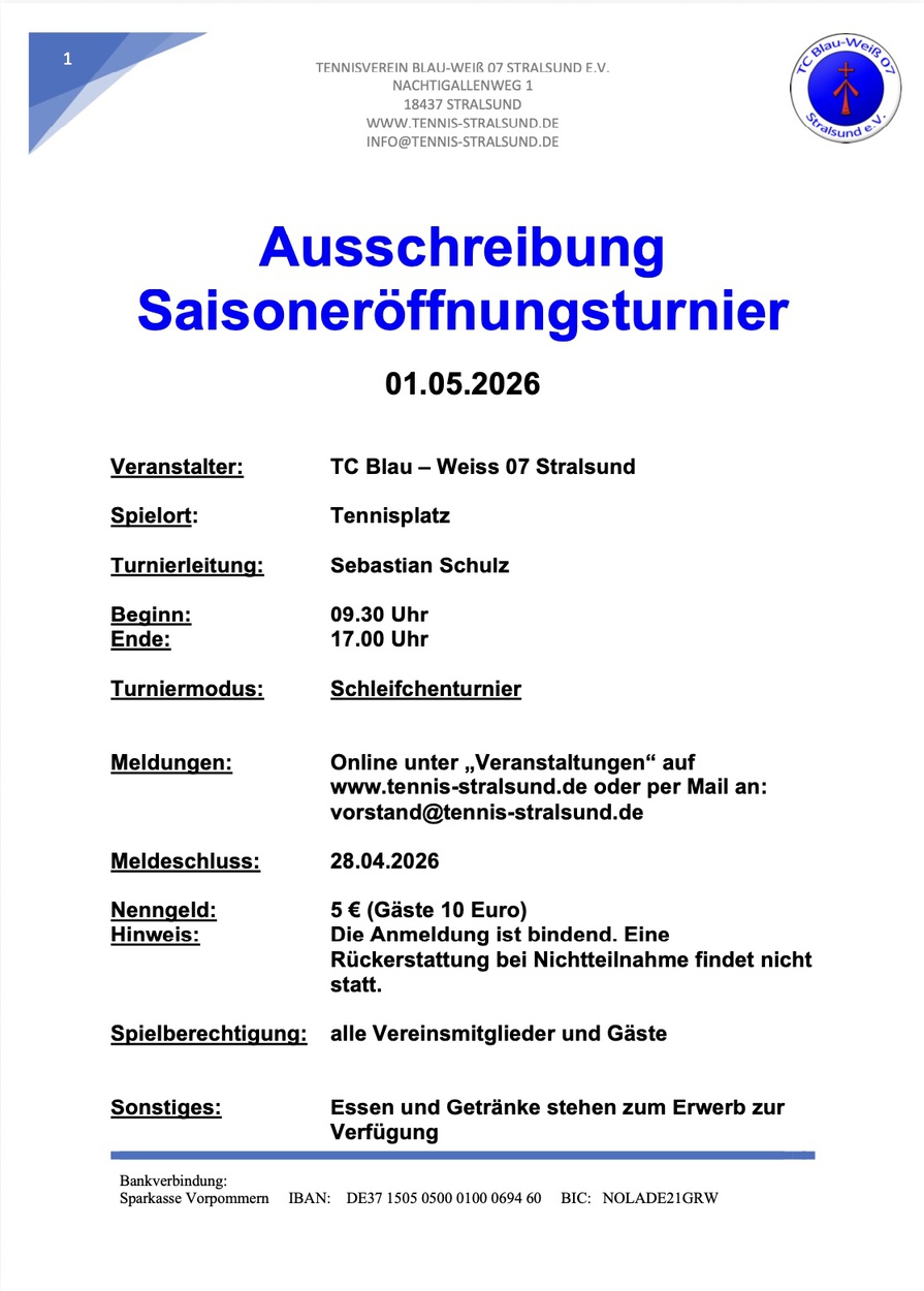 Anmeldung per Mail an vorstand@tennis-stralsund.de oder direkt auf der Webseite unter "Veranstaltungen".
