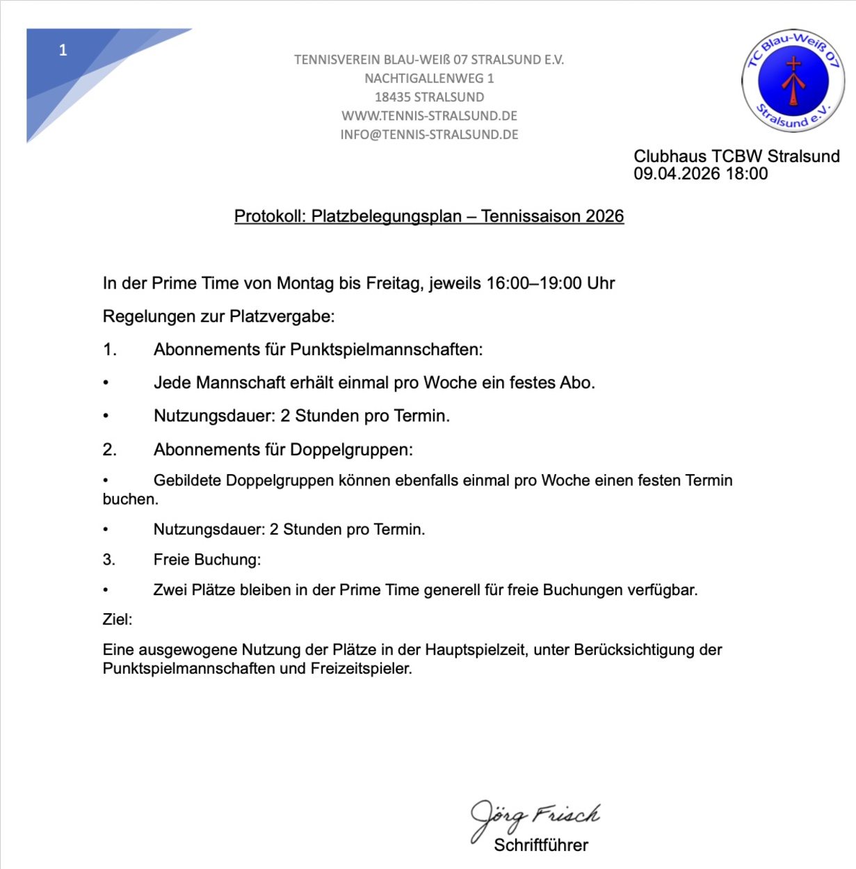Sehr geehrte Mitglieder. Bei der gestrigen Mitgliederversammlung wurde ein neues Vorgehen beim Platzbelegungsplan durch die Mitgliederversammlung beschlossen, um die Möglichkeit des Tennisspielens für alle in der Kernzeit von 16-19 Uhr zu ermöglichen. Den Beschluss dazu gibt es hier vorab als „Teilprotokoll“, damit der vorläufige Belegungsplan in den nächsten Tagen erarbeitet werden kann.